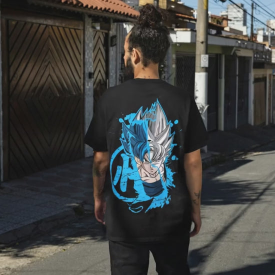 Back: A stunning, split graphic of Goku's iconic transformations: one half in Super Saiyan Blue and the other in the powerful Ultra Instinct form. The design is framed by dynamic blue and white energy bursts and includes a subtle Kanji symbol (likely Goku's "Go" kanji), all popping vibrantly against the black fabric.